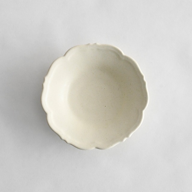 樋口 萌 作 17 染付輪花小皿 三重県で作陶に励む樋口萌さん。 マットな温かみのある乳白色の釉薬と、ノスタルジックな色調の染付のハーモニーが印象的な陶器を制作されています。 高台部分に縄目文様を施し弁柄を巻く意匠が、さりげなくも存在感ある器に仕上げています。 - サイズ:直径約11.5cm 高さ約2.2cm
