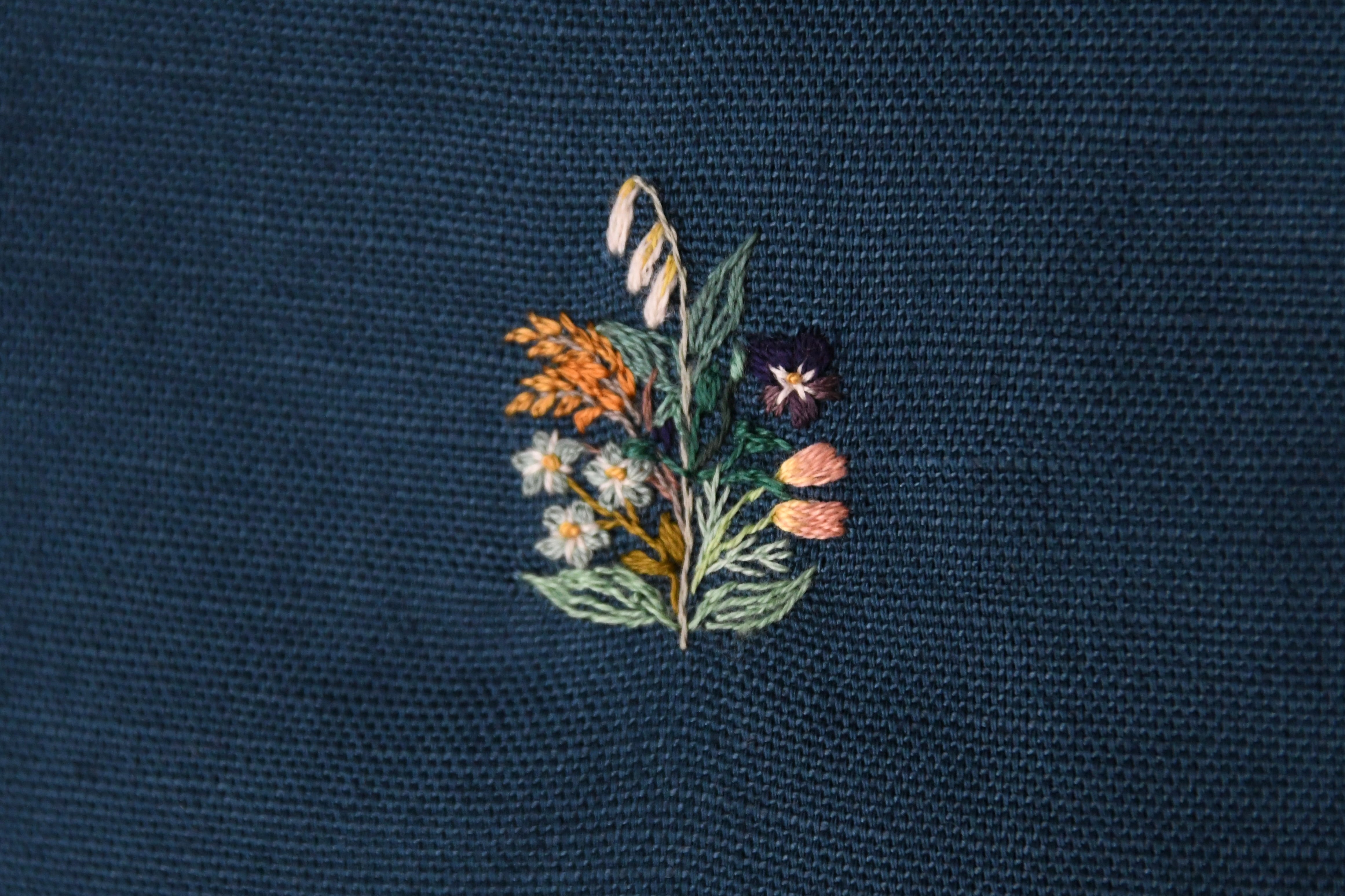 一本どりの糸で、細い彩り豊かな線で描くように綴る羽田さんの刺繍には、繊細で可憐ななかに、すっと真っすぐに立っている草花のような凛とした佇まいが感じられます。