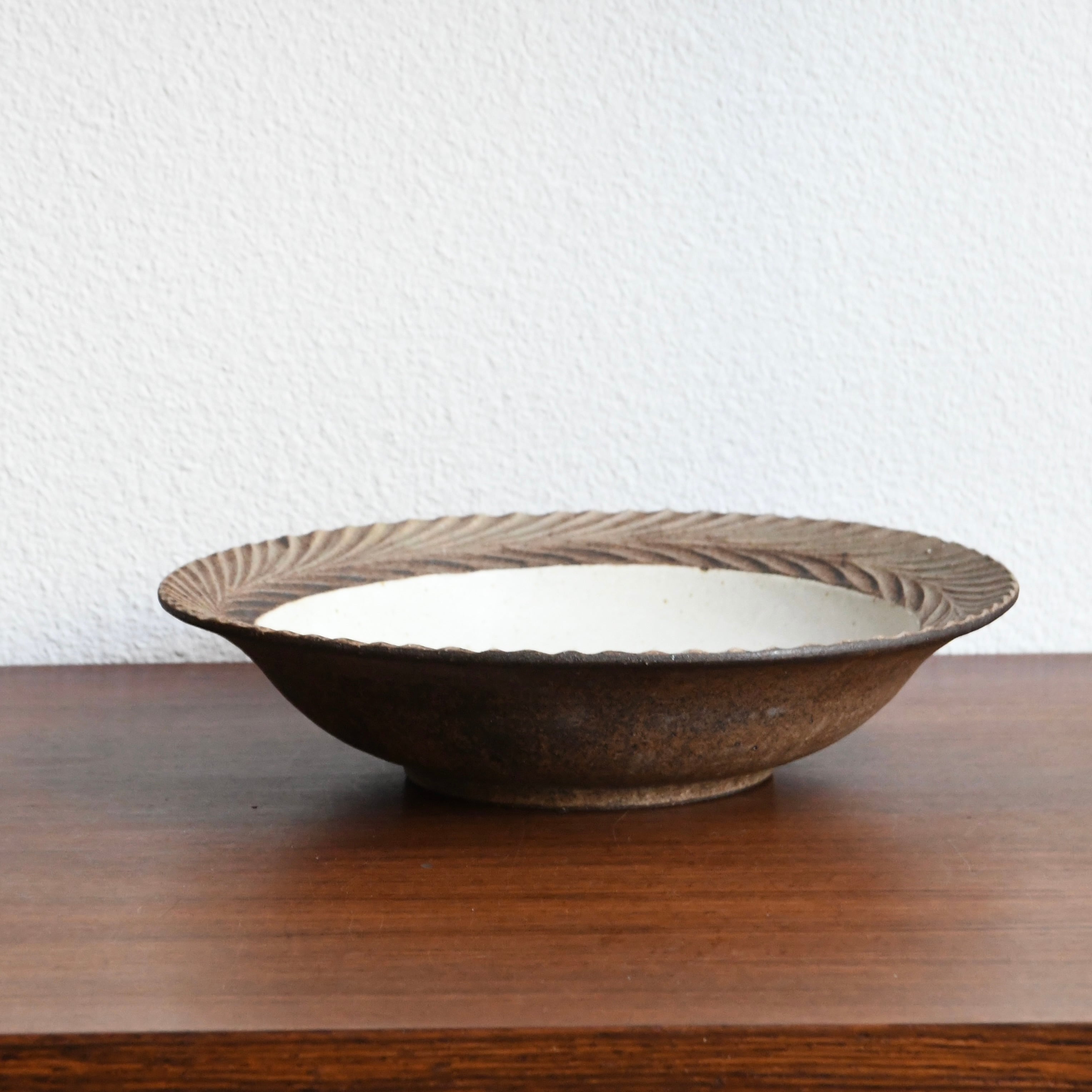 優しい色調の白と縁の茶のコントラストが印象的な器です。